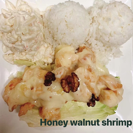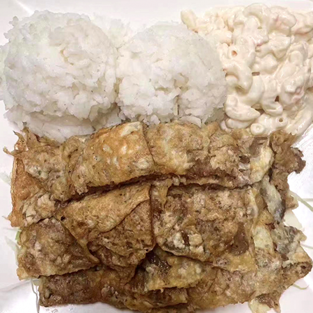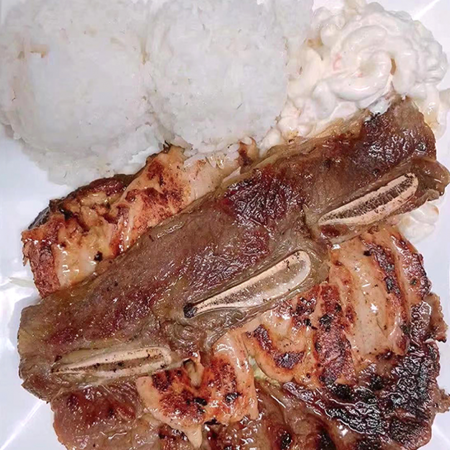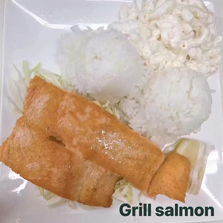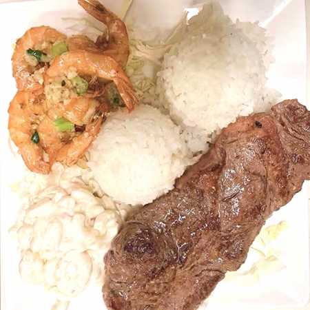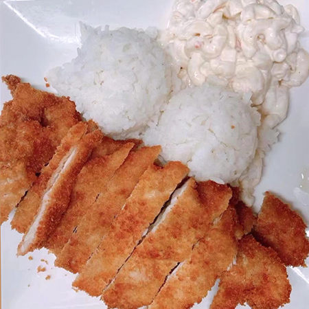 Mini plate: served with 1 scoop of rice and 1 scoop of macaroni salad. Regular plate: served with 2 scoops of rice and 1 scoop of macaroni salad.