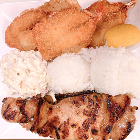 Mini plate: served with 1 scoop of rice and 1 scoop of macaroni salad. Regular plate: served with 2 scoops of rice and 1 scoop of macaroni salad