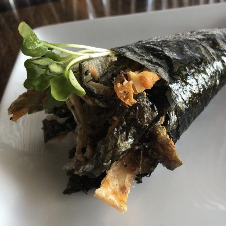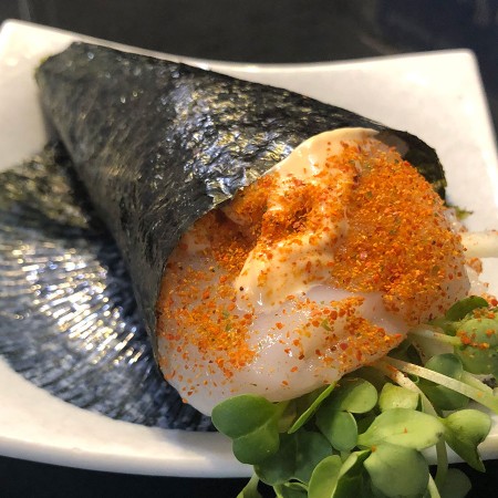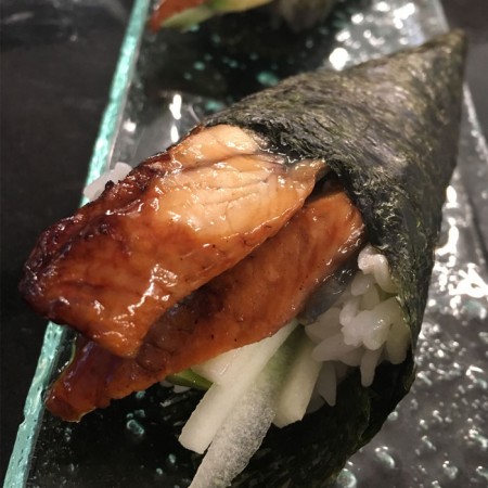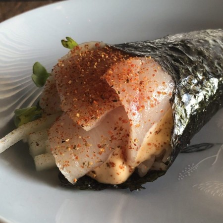 Temaki is a hand-rolled type of sushi characterized by its conical shape. The dish consists of rice, raw fish, and vegetables wrapped in a piece of nori seaweed. Due to the ease of preparation, it is most commonly made at home, and is somewhat hard to find in regular sushi restaurants in Japan. Traditionally, temaki is prepared for home parties and large family celebrations. It is also a great way of introducing foreigners to sushi. It is almost always eaten by hand because chopsticks are quite