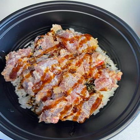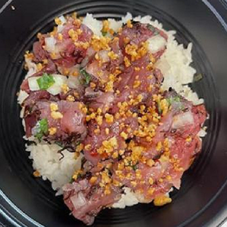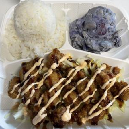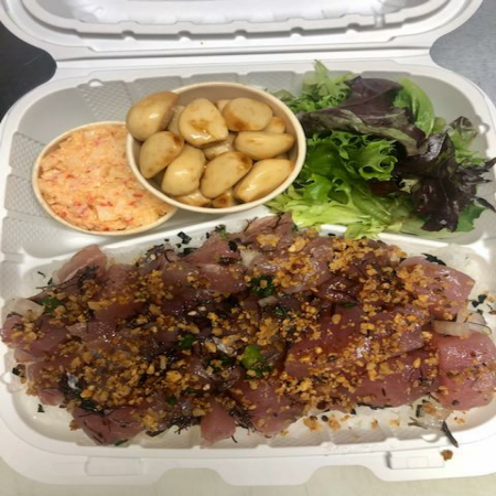 Rice,Ahi Katsu, Mac or toss Salad Ahi marinated w/shoyu & sugar